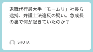 トレンド 退職代行最大手「モームリ」社長ら逮捕、弁護士法違反の疑い。急成長の裏で何が起きていたのか? 2026年2月3日、退職代行最大手「モームリ」の運営会社社長・谷本慎二容疑者らが逮捕されました。なぜトレンドになっているのか、逮捕の理由(弁護士法違反)や話題の人物の詳細、今後のサービスへの影響について詳しく解説します。 2026.02.03 トレンド