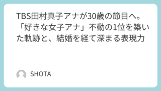 トレンド TBS田村真子アナが30歳の節目へ。「好きな女子アナ」不動の1位を築いた軌跡と、結婚を経て深まる表現力 026年2月3日に30歳を迎えたTBS田村真子アナウンサー。昨年末の結婚発表から最新のSNS投稿、好きな女性アナランキング2連覇の背景まで、彼女の人気の秘密を詳細記事で徹底解説。30代の展望についても迫ります。 2026.02.03 トレンド