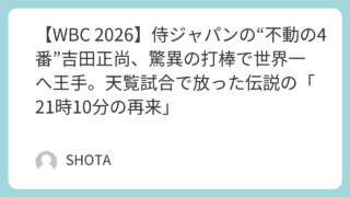 トレンド 【WBC 2026】侍ジャパンの“不動の4番”吉田正尚、驚異の打棒で世界一へ王手。天覧試合で放った伝説の「21時10分の再来」 吉田正尚選手のWBC2026での逆転本塁打やメジャーリーグ成績、NPBキャリアを徹底解説。侍ジャパンの活躍とレッドソックスでの状況を事実ベースで紹介。 2026.03.08 トレンド