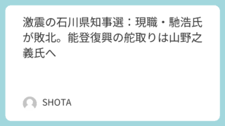 トレンド 激震の石川県知事選:現職・馳浩氏が敗北。能登復興の舵取りは山野之義氏へ 2026年3月8日投開票の石川県知事選挙。前金沢市長の山野之義氏が現職の馳浩氏を6,110票差で破り初当選。能登半島地震の震災対応への評価や、奥能登知事室の設置を掲げた山野氏の勝因、馳氏の経歴を詳しく解説します。 2026.03.09 トレンド